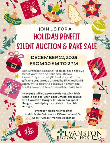 Join Evanston Regional Hospital for a festive Silent Auction and Bake Sale. Bid on beautifully curated gift baskets and other giftable treasures donated by ERH and UMG staff, while enjoying delicious homemade treats from the senior volunteer bake sale.