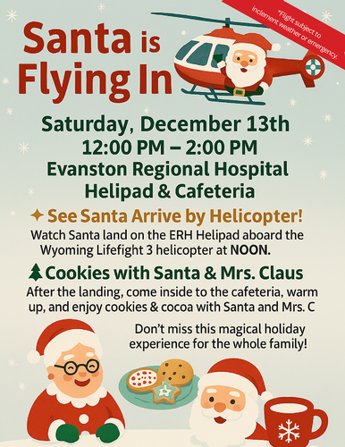 Watch Santa land on the ERH Helipad aboard the Wyoming Lifeflight3 helicopter at Noon.