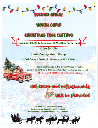 Come participate in the Youth Camps forestry project by cutting a Christmas Tree for your home for FREE. Please check in with staff members before cutting to receive your coupon. Hot cocoa and refreshments will be provided.