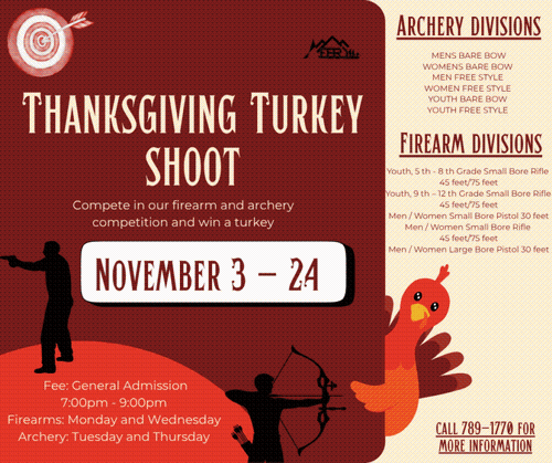 Firearm Divisions: Youth 5th - 8th Grade Small Bore Rifle 45/75 feet, Youth 9th - 12th Grade Small Bore Rifle 45/75 feet, Men/Women Small Bore Pistol 30 feet, Men/Women Small Bore Rifle 47/75 Feet, Men/Women Large Bore Pistol 30 feet.